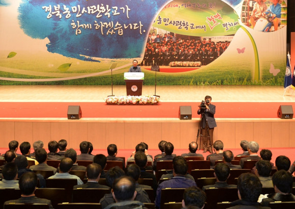 김관용 도지사는 격려사를 통해“8년 전 경북농민사관학교를 개교 할 당시에는 걱정하는 분들도 많았지만 이제는‘전국 최고 농어업인 평생교육기관’으로 확실히 자리매김을 했고, 그 인기가 날로 더해가고 있어 매우 자랑스럽게 생각한다. FTA를 비롯해 우리 농어업에 글로벌 위기가 끝없이 다가오고 있지만 이 모든 난관을 극복하는 길은 결국 사람이며, 그 중심에 경북농민사관학교가 있다”고 강조했다.