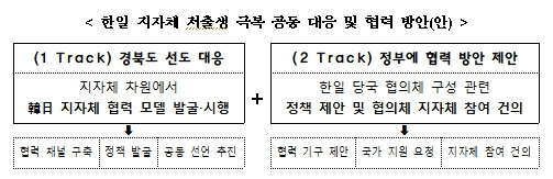 경북도의 한일 지자체 공동 대응 및 협력 방안은 ①협력 채널 구축, 정책 발굴, 공동 선언 추진 등 지자체 차원의 협력 모델 발굴. 시행과 ②협력 기구 제안, 국가 지원 요청, 지자체 참여 건의 등 정부에 협력 방안을 제안하는 게 두 축이다.