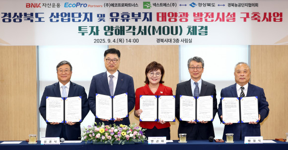 |  | | | ⓒ 씨비엔뉴스 | | [cbn뉴스=이재영 기자] 경상북도는 4일 도청에서 BNK자산운용㈜, ㈜에코프로파트너스, 넥스트에스㈜, 경북농공단지협의회와 함께 ‘산업단지 및 유휴부지 태양광 발전시설 구축사업’을 위한 공동협력 및 투자 양해각서(MOU)를 체결했다.
