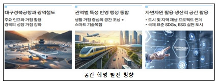 핵심 과제로 ➀주요 인프라 거점을 연결하고, 경북의 잠재력을 강화하기 위해 대구경북공항과 광역철도 조기 건설, ➁권역별 특성을 반영한 행정통합 추진, ➂자연자원 등 생산적 공간을 활용한 국제 표준 SDGs, ESG를 실현한 도시가 제안되었다.