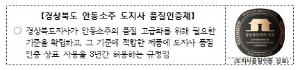 지난 5월에 도입한 '안동소주 도지사품질인증제'는 2023년 2월 이철우 도지사의 “유럽 위스키보다 200년이나 앞선 증류 기술을 자랑하는 안동소주는 750년 긴 역사와 전통을 지닌 음식문화 유산으로 우수성을 알리고 세계인이 즐겨 찾는 술로 거듭나는 산업화는 필요하다”는 확신으로부터 시작됐다.