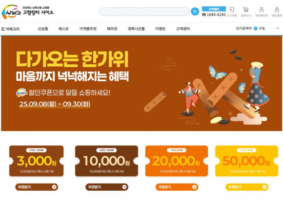 |  | | | ↑↑ 한가위 할인쿠폰 | | ⓒ 씨비엔뉴스 | | [cbn뉴스=이재영 기자] 경상북도는 온라인 농특산물 쇼핑몰 ‘경북 고향장터 사이소’에서 추석을 맞아 오는 30일까지 추석 선물 기획전을 운영한다.