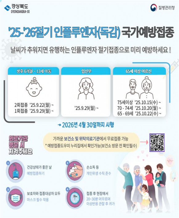 |  | | | ⓒ 씨비엔뉴스 | | [cbn뉴스=이재영 기자] 경상북도는 다가오는 겨울철 인플루엔자 유행에 대비해 22일부터 내년 4월 30일까지 고위험군을 대상으로 2025년~2026년 절기 인플루엔자 국가 예방접종을 한다.