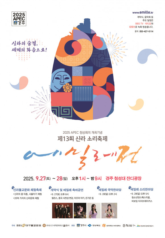 올해로 13회를 맞는 ‘에밀레전’은 ‘신라의 숨결, 세계의 화음으로!’를 주제로, 전통과 현대가 어우러진 공연과 다채로운 체험 프로그램을 통해 경주의 역사적 가치와 함께 ‘2025 APEC 정상회의’ 성공개최 염원을 세계에 알리는 글로벌 문화축제의 장으로 펼쳐진다.