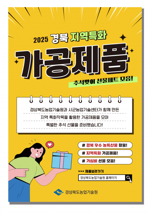 조영숙 경상북도농업기술원장은 “추석을 맞아 경북의 지역 특색이 담긴 가공품으로 소중한 분들께 감사의 마음을 전하길 바란다”며 “앞으로도 특화작목 기반의 가공제품 개발과 산업화를 통해 농업의 부가가치를 높이고, 경북 농식품 산업의 경쟁력을 강화하겠다”고 밝혔다.