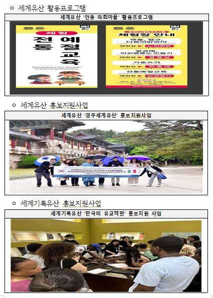 세계유산 활용프로그램은 국비 6억 2,000만원을 확보, 경주, 안동, 영주, 고령에 소재한 세계유산을 활용한 교육·체험·공연 등을 통해 유산가치를 국민과 더불어 향유 할 계획이다. 공모사업에서 인기가 높아 해마다 경쟁률이 높아지고 있다.