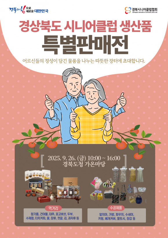|  | | | ↑↑ 포스터 | | ⓒ 씨비엔뉴스 | | [cbn뉴스=이재영 기자] 경상북도는 다가오는 추석 명절을 맞아 26일 도청 가온마당에서 ‘2025년 경상북도 추석맞이 노인일자리 생산품 특별판매전’을 개최한다.