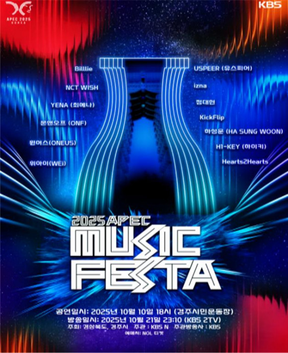 |  | | | ↑↑ 포스터 제공=경상북도청 | | ⓒ 씨비엔뉴스 | | [cbn뉴스=이재영 기자] 경상북도와 경주시는 10일 오후 6시, 경주 황성공원 내 시민운동장에서 ‘APEC 뮤직페스타’를 개최한다. 이번 행사는 2025년 APEC 정상회의의 성공 개최를 기원하고, K-POP이라는 세계적 문화 콘텐츠를 통해 대한민국 문화의 다양성과 우수성을 전 세계에 알리기 위해 마련됐다.