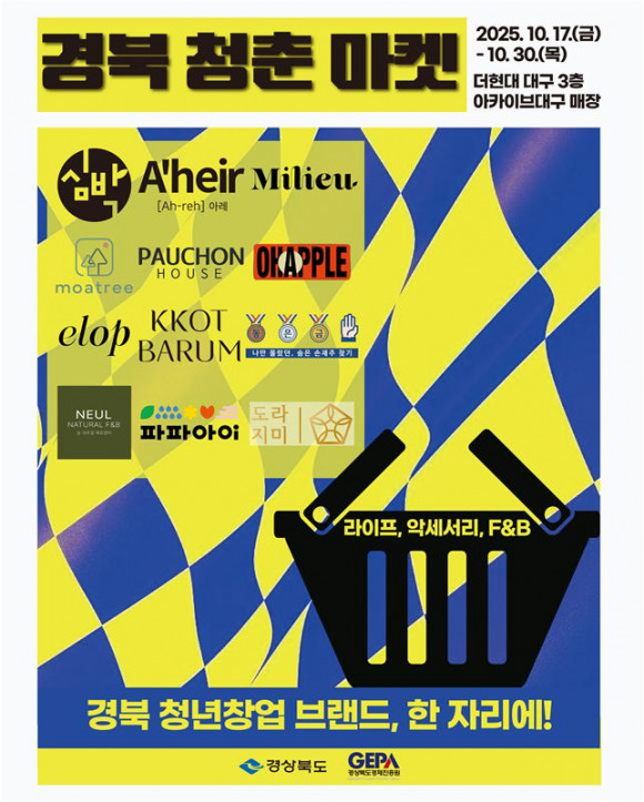 |  | | | ↑↑ 포스터 | | ⓒ 씨비엔뉴스 | | [cbn뉴스=이재영 기자] 경상북도와 경상북도경제진흥원은 17일부터 30일까지 2주간 더현대 대구 3층 아카이브대구에서 ‘경북 청춘 마켓’ 팝업스토어를 운영한다.