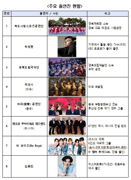 이어 러시아 페도르 쿠바이체프 재즈밴드, 중국 비파공연단 등 세계적 명성을 지닌 공연단과 K-POP 신인 그룹 비보이즈(Be Boys), TV조선 미스터트롯3 최종 우승자 김용빈 등 다양한 장르의 국내외 아티스트가 열정적인 무대를 펼친다.