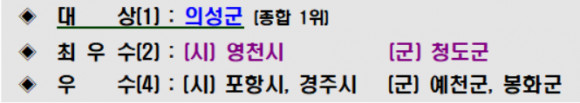 - (최우수상) 영천시·청도군, (우수상) 포항시·경주시·예천군·봉화군 -