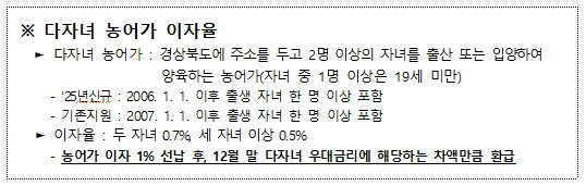 경상북도, 다자녀 농어가 농어촌진흥기금 이자 최대 0.5% 인하!