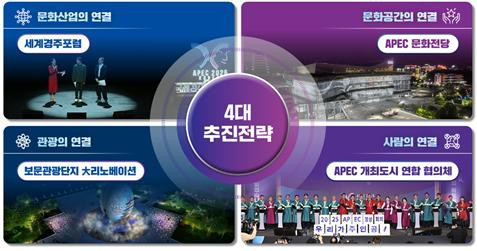 |  | | | ↑↑ 포스트_APEC_추진_전략_보고회 | | ⓒ 씨비엔뉴스 | | 다음으로 포스트 에이펙(APEC) 사업에 대한 구체적인 설명이 이어졌다. 먼저 문화관광 분야의 경우 K-컬처와 경주 에이펙(APEC) 성공으로 경북 문화관광산업의 성장 가능성이 커진 만큼 가장 한국적인 문화유산과 관광자원을 활용해 글로벌 10대 문화관광거점으로 도약한다는 방침이다.