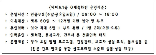 경상북도는 운영지침에 따라 영아 안전·위생·건강관리 기준을 철저히 적용하고, 0세 발달 단계에 맞는 프로그램과 인력 운영을 지속 개선해 영아 돌봄과 부모 회복을 함께 지원하는 돌봄 체계를 강화해 나갈 계획이다.