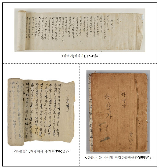 등재신청 대상인 ‘내방가사’기록물은 총 567점으로, 이 중 한국국학진흥원이 85곳의 소유자로부터 기탁받아 관리 중인 292점과 국립한글박물관이 소장한 226점을 중심으로 구성되었다.