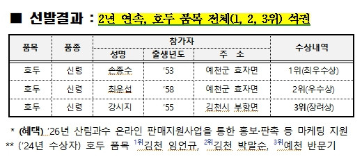 올해 산림과수 분야에는 경북 9개 임가를 포함해 전국 각지의 우수 산림과수 재배 임가가 참여해 치열한 경쟁을 펼쳤다. 특히 호두는 최근 고소득 임산물로 주목받으며 출품량이 증가해 경쟁이 더욱 치열했던 품목이다.