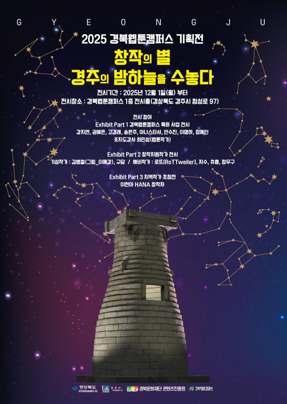 |  | | | ↑↑ 포스터 | | ⓒ 씨비엔뉴스 | | [cbn뉴스=이재영 기자] 경북문화재단 콘텐츠진흥원(원장 이종수, 이하 진흥원)이 운영하는 경북웹툰캠퍼스(이하 캠퍼스)가 2025년 한 해를 마무리하는 기획전 <창작의 별 경주의 밤하늘을 수놓다>를 1일부터 경주 황리단길 캠퍼스 전시홀에서 상설로 선보인다.