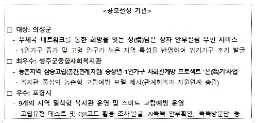 이번 우수사례 공모전 심사 결과 대상은 의성군(우체국 네트워크를 활용한‘정(情 )담은 상자’안부살핌서비스) 최우수는 성주군종합사회복지관(농촌 삼중고립 중장년 1인가구 사회관계망 프로젝트‘온(溫)기 사업) 우수는 포항시(지역밀착형 복지관 운영 및 스마트 고립예방 운영)가 선정됐다. 또한 평소 주변 이웃을 살피고 고립가구 지원에 이바지한 행복기동대 3명에게 도지사 표창을 수여했다. 행복기동대는 이·통장, 부녀회, 지역 사회보장협의체, 명예사회복지공무원 등 6천여 명으로 구성되어 있으며, 고립 위험 이웃을 직접 발굴하고 연계·지원하는 무보수 지역밀착형 인적안전망의 역할을 수행하고 있다.