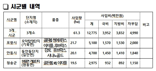 농식품부는 10월 공모를 시작으로 1차 서면평가, 2차 발표평가를 거쳐 전국 10개소, 165ha를 선정했으며, 경북도는 3개소, 61ha가 최종 선정되어 전국에서 최다 사업량을 확보하게 됐다.