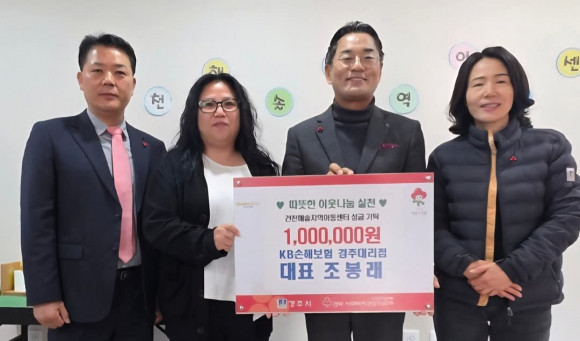 |  | | | ↑↑ 조봉래 대표(좌로부터 3번째) | | ⓒ CBN뉴스 - 경주 | | [cbn뉴스=이재영 기자] KB손해보험 경주대리점 조봉래 대표가 11일 오전 11시, 연말연시를 맞아 아동복지시설인 건천해솔지역아동센터를 방문해 성금 100만 원을 기탁했다. 조 대표는 주위의 어려운 이웃을 위해 20년을 넘게 성금 기탁을 이어가고 있다.