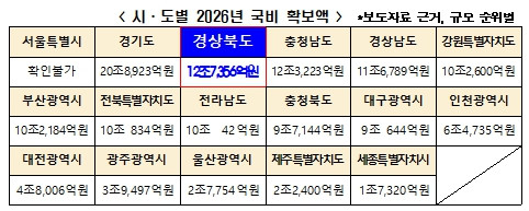 이 같은 국비예산 증가 폭과 규모는 전국 지방자치단체 중에서도 가장 두드러진 수준으로, 지역경제살리기와 민생회복을 비롯해 지역현안 해결, 미래 투자에 필요한 재정 여력을 확보하는 데 매우 중요할 것으로 기대된다. 이러한 성과는 새정부와 국회, 지역 정치권과의 긴밀한 공조를 바탕으로, 연초부터 가동한‘경북지방정부협력회의’, 국회 국비확보 캠프 등 경북도의 ‘전방위 총력 대응’전략이 체계적으로 작동한 결과였다. |  | | | ↑↑ 시·도별 2026년 국비 확보액 | | ⓒ 씨비엔뉴스 | |