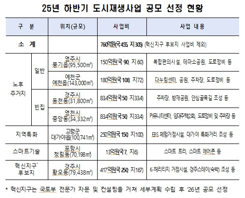 이번에 선정된 도시재생사업은 총사업비 760억원(국비455, 지방비305)을 투입하여 주민들이 쾌적하고 살기좋은 동네로 새롭게 재탄생한다. * 노후주거지 497억원(국 298, 지 199), 지역특화 250억원(국 150, 지 100), 스마트기술 13억원(국 7, 지 6)