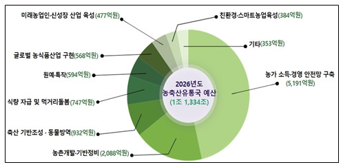 식량자급 기반 강화와 취약계층 먹거리 돌봄 확대(747억원)쌀 수급 안정과 식량자급률 제고를 위해 ‘전략작물직불제’에 405억원, ‘논 타작물 재배 지원’에 29억원을 편성해 중장기 식량안보 기반을 강화한다.