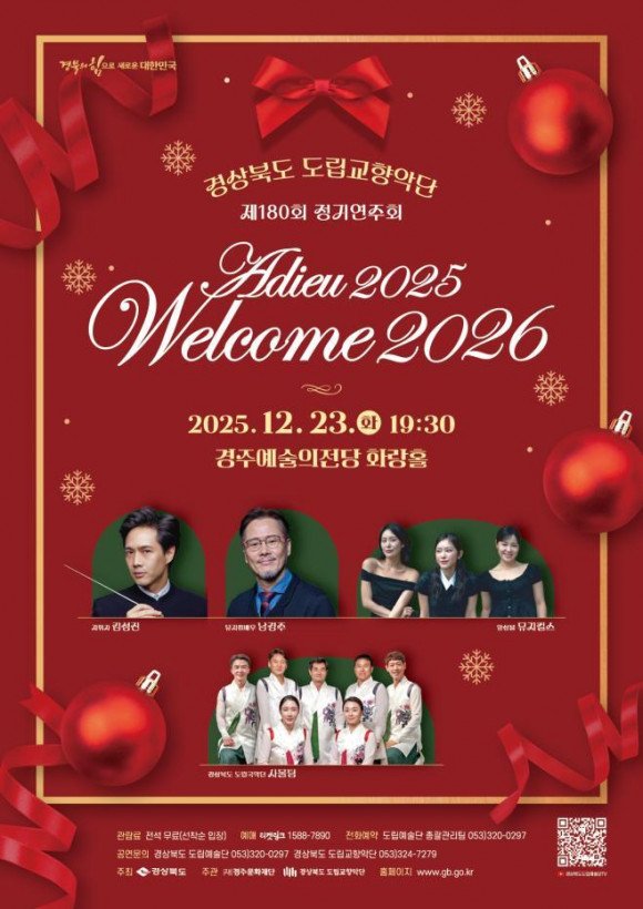 |  | | | ↑↑ 포스터 | | ⓒ 씨비엔뉴스 | | [cbn뉴스=이재영 기자] 경상북도 도립교향악단이 23일 경주예술의전당 화랑홀에서 제180회 정기연주회 ‘아듀 2025! 웰컴 2026!’를 개최한다.