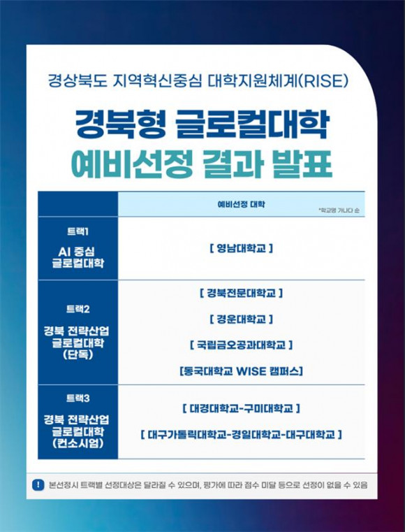 예비평가 결과, ‘인공지능(AI)중심 글로컬대학’에는 영남대학교의 ‘경북 AI-X 융합혁신 생태계 조성’ 사업이 선정됐으며, ‘경북 전략산업 글로컬대학’ 분야에서는 단독형으로는 국립금오공과대학교의 ‘K-Linchpin 기반 K-전략산업 AX 혁신·지역정주 Hub 구축’과 경운대학교의 ‘AAM산업 특성화 대학’, 경북전문대학교의 ‘G-MATE 기반 전략산업 인재양성 AI+ NEXUS University 구현’, 동국대학교 WISE캠퍼스의 ‘APEC 레거시 기반 지역정주형 Metacity 플랫폼 구축’이 선정되었으며, 연합형으로는 대구가톨릭대학교·경일대학교·대구대학교의 ‘경북형 바이오혁신대학(K-BIC)’, 대경대학교·구미대학교의 ‘K-문화콘텐츠와 하이테크 융합을 통한 경북형 문화관광산업 육성’ 과제가 선정되었다.