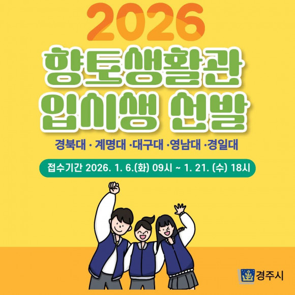 |  | | | ↑↑ 2026년 향토생활관 입사생 모집 | | ⓒ 씨비엔뉴스 | | [cbn뉴스=이재영 기자] 경주시는 지역사회 발전을 이끌 향토인재를 체계적으로 육성하기 위해 2026년 경주시 향토생활관 입사생을 모집한다고 6일 밝혔다.