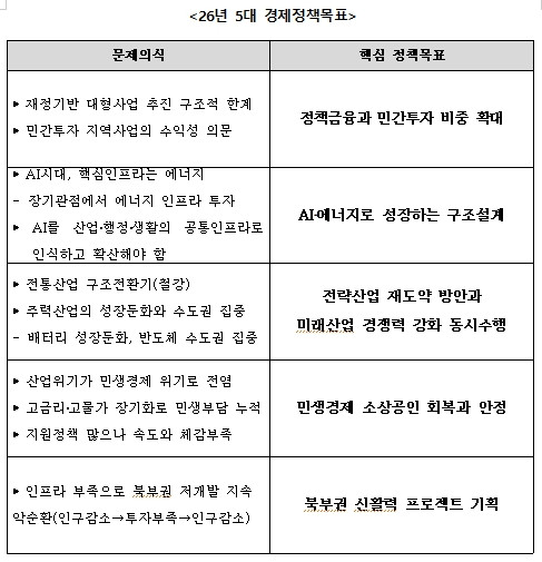 ◈ 2026년 5대 경제정책목표 설정, 민생‧소상공인 특별대책 주문 문제해결을 위해 ▴정책금융과 민간투자 비중확대, ▴AI와 에너지로 성장하는 구조설계, ▴전략산업 재도약 방안과 미래산업 경쟁력 강화 동시 수행, ▴민생경제와 소상공인 회복과 안정, ▴북부권 신활력 프로젝트 추진으로 이루어진 ‘2026년 5대 경제정책목표’를 제시했다.