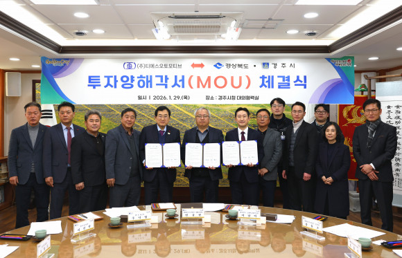 |  | | | ⓒ 씨비엔뉴스 | | [cbn뉴스=이재영 기자] 경상북도는 29일 경주시청에서 경주시, ㈜티에스오토모티브와 자동차 차체 부품 생산공장 증설을 위한 투자양해각서(MOU)를 체결했다.