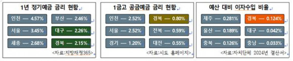 |  | | | ⓒ 씨비엔뉴스 | | 2024년 자치단체 결산서에 따르면 일반회계 세입예산 대비 일반회계 공공예금 이자수입의 비율은 제주가 0.281%로 가장 높았고, 경북은 0.124%로 전체 6위, 광역도 단위 중 3위로 확인됐다.