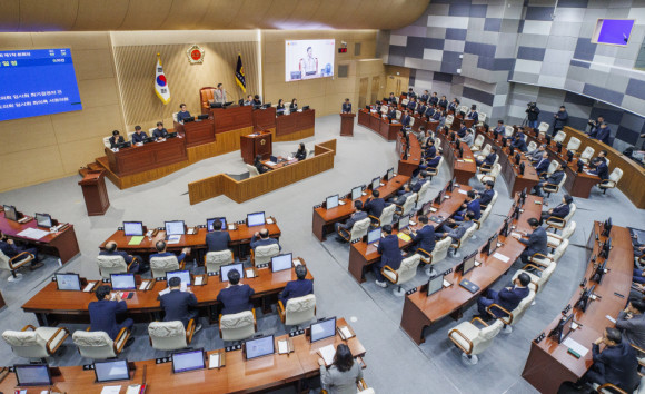 박성만 의장은 개회사를 통해 “제12대 도의회가 마무리 단계로 접어드는 엄중한 시기인 만큼, 끝까지 의정활동에 전력을 다해 유종의 미를 거둬달라”고 당부한다.