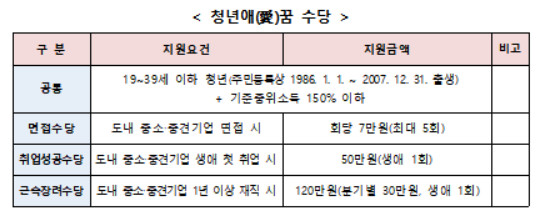 ▲면접수당은 도내 중소․중견 기업에 면접 시 회당 7만 원(1인당 최대 5회)을 지원하고 ▲취업성공수당은 도내 취업 경력이 없는 미취업 청년이 처음으로 중소. 중견기업에 취업했을 때 축하금 50만 원을 지급하며, ▲근속장려수당은 중소. 중견기업에 취업하여 1년 이상 재직 중이면서, 현 사업장에 근로개시일부터 신청일까지 도내 주민등록을 유지한 청년에게 분기별로 30만 원씩, 총 120만 원을 지원한다.