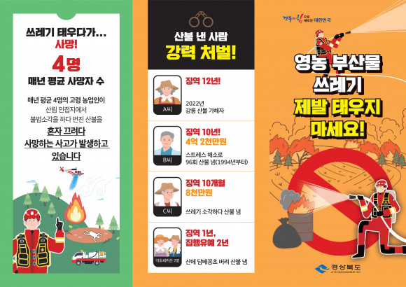 |  | | | ↑↑ (리플렛)산불예방 | | ⓒ 씨비엔뉴스 | | [cbn뉴스=이재영 기자] 경북도가 봄철 대형 산불 재난 예방을 위해 지난 28일(토) 오전 9시부터 ‘전국 산불재난 위기대응 경상북도 재난안전대책본부’를 운영한다.