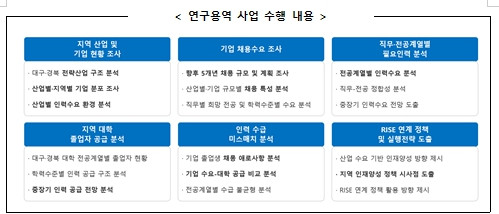 용역에서는 ▵지역 산업 및 기업 현황 조사, ▵기업 채용 수요 조사, ▵직무. 전공계열별 필요 인력 분석, ▵지역대학 졸업자 분석, ▵인력의 공급과 수요 불일치 분석, ▵경북성장 인재양성체계(앵커, 기존 라이즈) 연계 정책 및 지역 인재 양성 실행 전략 도출 등이 주로 다뤄진다.
