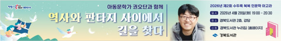 |  | | | ↑↑ 현수막(아동문학가_권오단과_함께) | | ⓒ 씨비엔뉴스 | | [cbn뉴스=이재영 기자] 경북도서관은 오는 28일(화) 저녁 7시, 도서관 2층 강당에서 ‘2026년 경북도서관 수두룩 북북 인문학 아고라 2회차’를 개최한다. 이번 강연은 역사에 문학적 상상력을 더하는 스토리텔러 권오단 작가를 초청해 ‘역사와 판타지 사이에서 길을 찾다’를 주제로 진행된다.