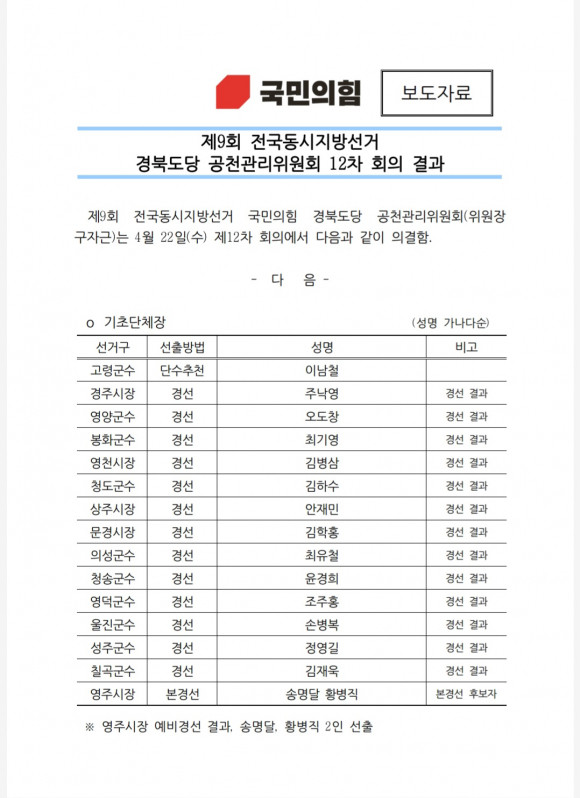 국민의힘 경북도당 공천관리위원회는 22일 오후 회의를 개최해 경북 기초단체장 후보 경선 결과를 발표했다.