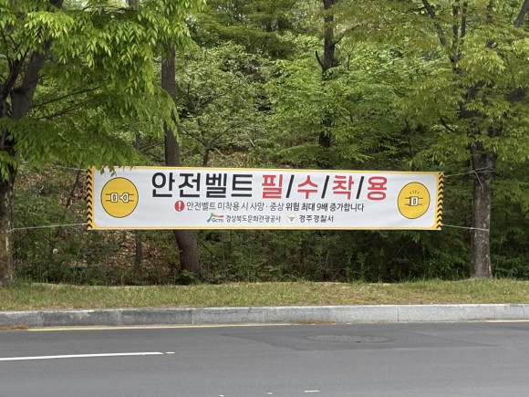 |  | | | ↑↑ 안전벨트 필수착용 현수막 부착(보문단지) | | ⓒ CBN뉴스 - 경주 | | [cbn뉴스=이재영 기자] 경주경찰서(서장 양순봉)는 최근 증가하는 교통사망사고에 선제적으로 대응하기 위해 ‘안전벨트 필수착용’ 홍보 현수막을 주요 거점에 집중 부착하며 시민 안전의식 제고에 나섰다.