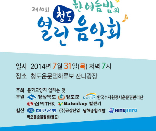 |  | | | ↑↑ 제10회 한여름 밤의 청도열린음악회 | | ⓒ CBN 뉴스 | | [염순천기자]= 문화잡지 ‘일하는멋(김진보 대표)’이 주최하는 제10회 ‘한여름 밤의 청도열린음악회’가 31일 오후 7시 청도군 운문댐 하류보 잔디광장에서 펼쳐진다.
