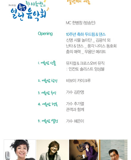 행사 출연진으로는 우리나라 최고의 디바 가수 혜은이, 카페음악의 여왕 가수 김란영, 기타하나만 가지고 수많은 관객을 웃기고 울리는 포크 뮤지션 추가열, 세계대회를 석권한 비보이& 팝핀 카이크루, 4명의 성악가들로 구성된 인칸토솔리스트의 뮤지컬음악, 방송 전문 무용단 메리트 단원 등이 참여해 방송인 한병창씨의 사회로 7시부터 약 두 시간 가량 열릴 예정이다.