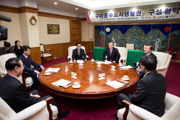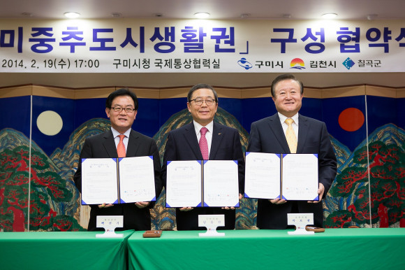 |  | | | ⓒ CBN 뉴스 | | [이재영 기자]= 구미시(시장 남유진)는 2. 19(수) 오후 5시 구미시청 국제통상협력실에서 박근혜 정부 지역발전정책의 핵심인 ‘지역행복생활권’ 추진에 선제적으로 대응하기 위해 김천시, 칠곡군 등 3개 시군이 ‘구미중추도시생활권’을 구성하고, 협약식을 가졌다.
